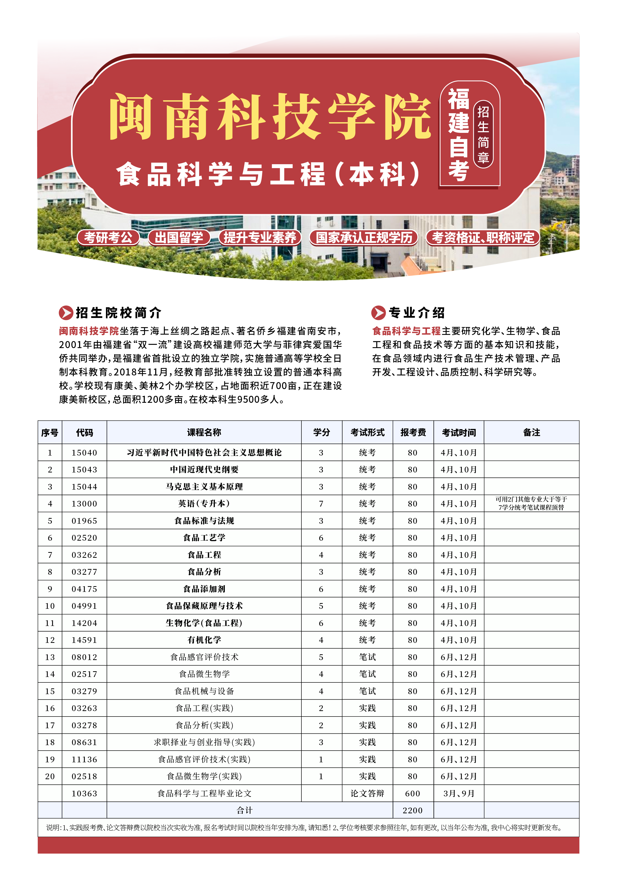 本文标签:福建自考 培训招生 2026年闽南科技学院小自考《食品科学与工程_本科》招生简章