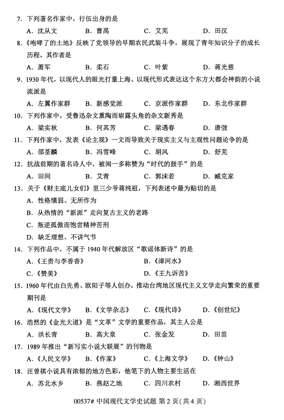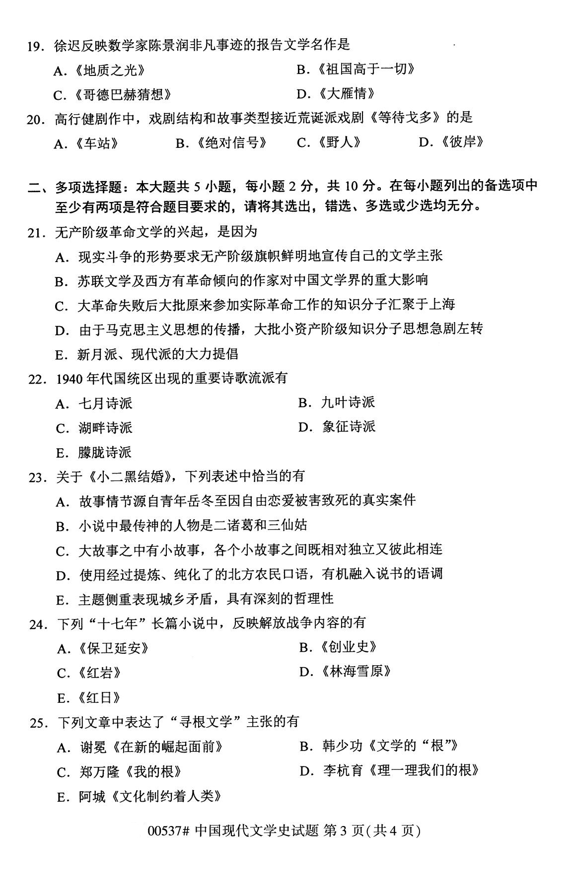 福建省2020年8月自学考试本科00537中国现代文学史真题